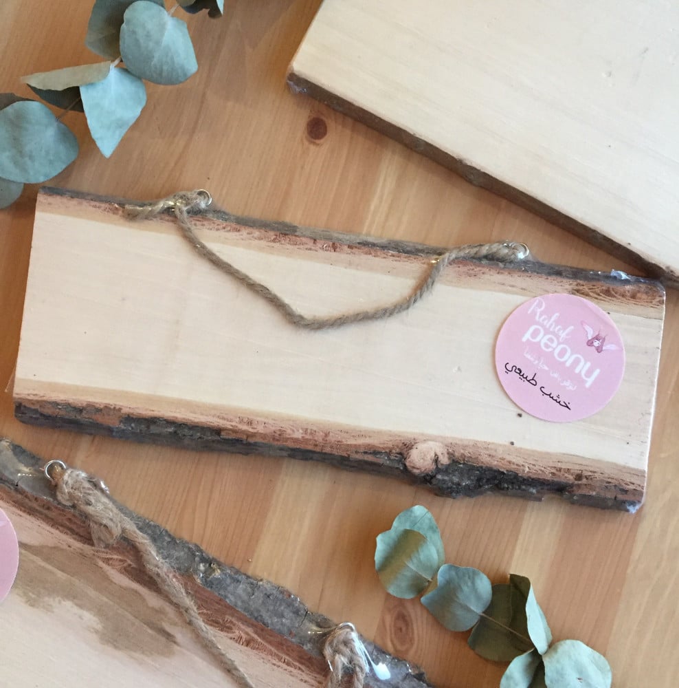 تعليقة خشب طبيعية مع حامل بخيط خيش يتراوح العرض من 23 - 25 سم و الطول مابين 8 - 10 سم تقريباً