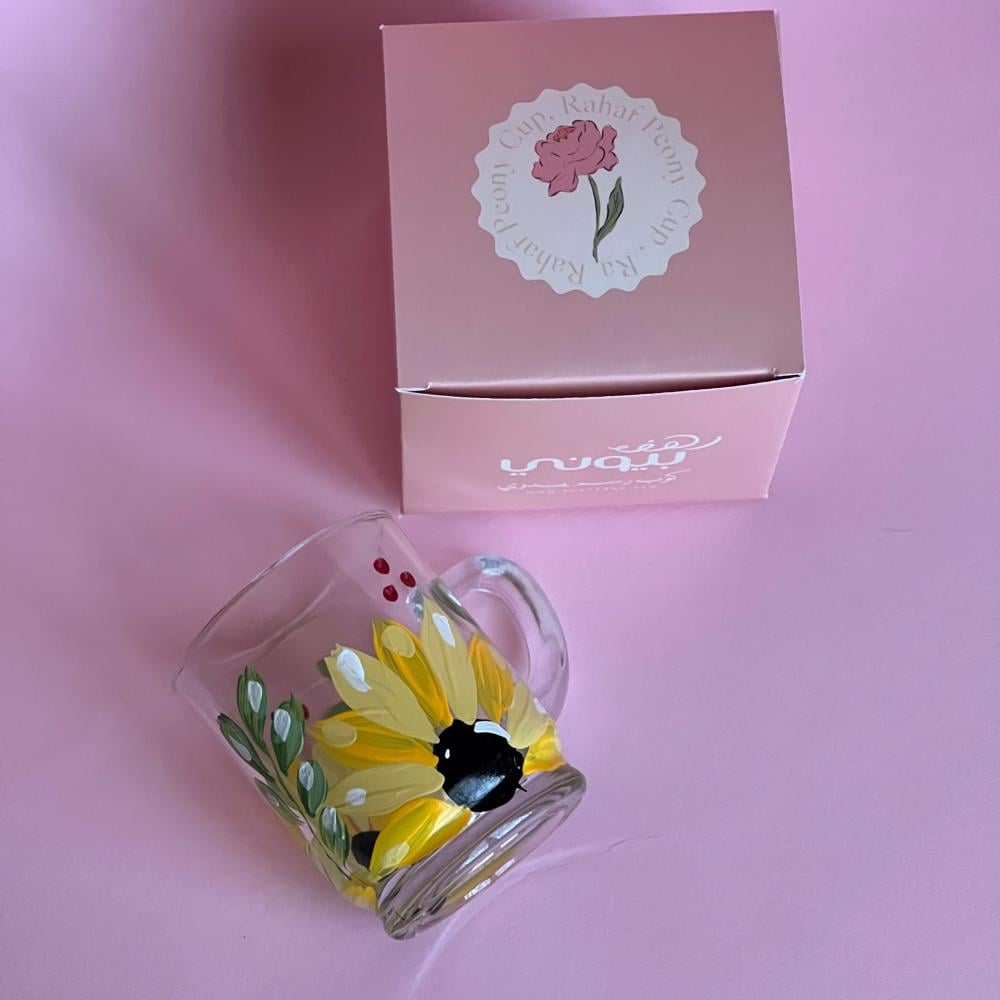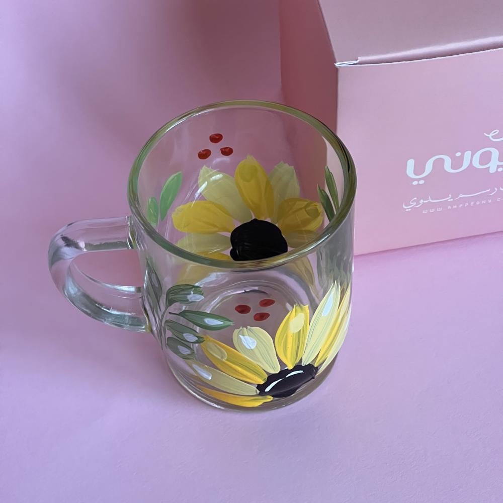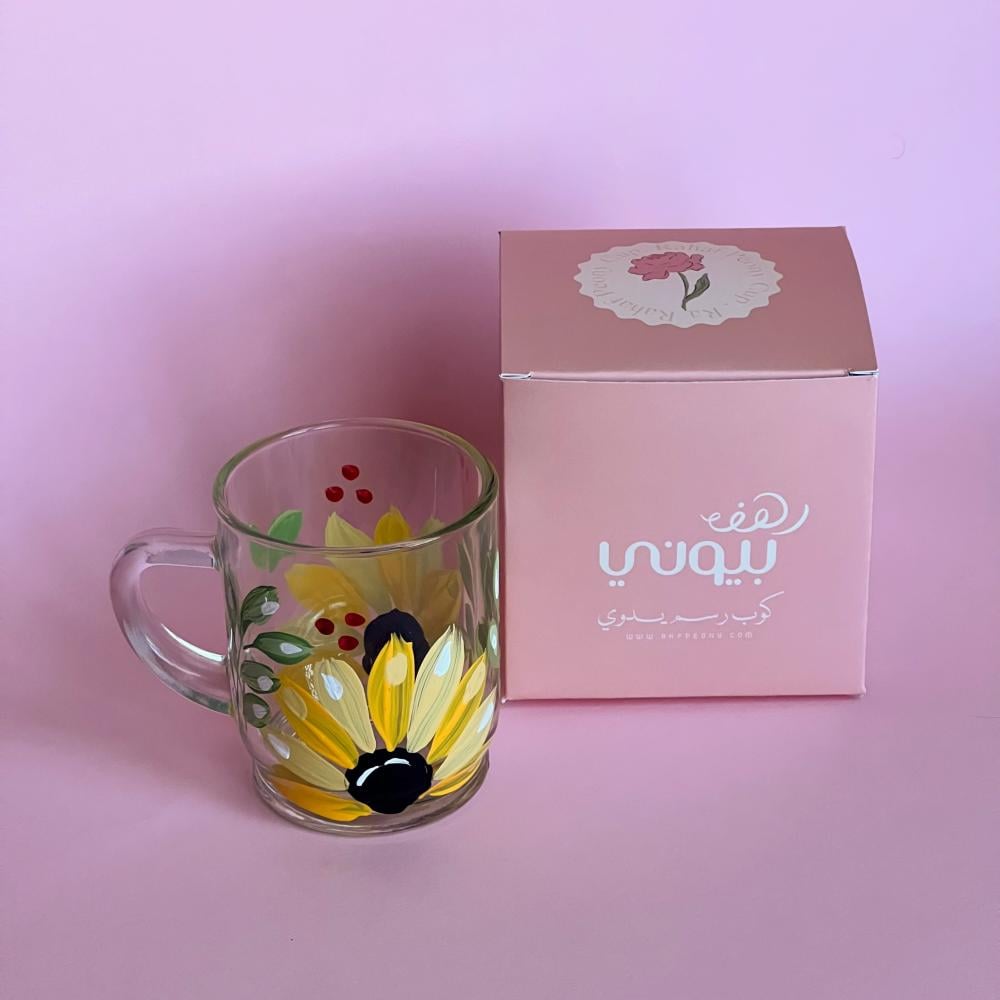 كوب زجاجي برسومات يدوية داخل علبة أنيقة مناسبة للاهداء