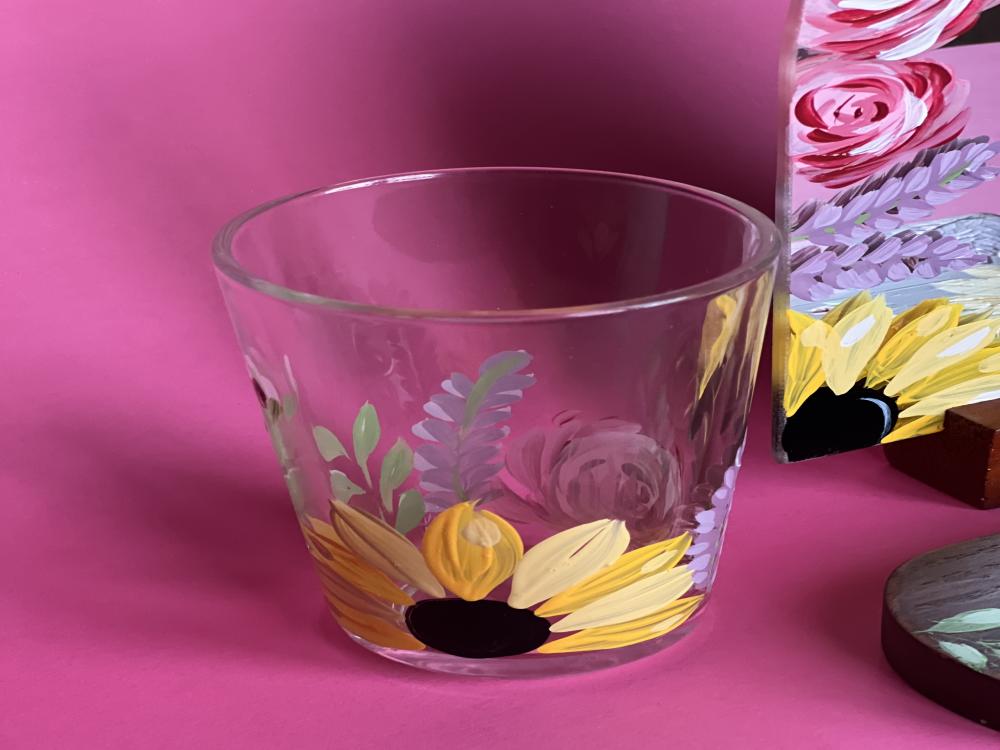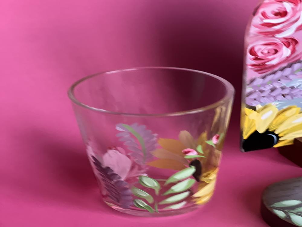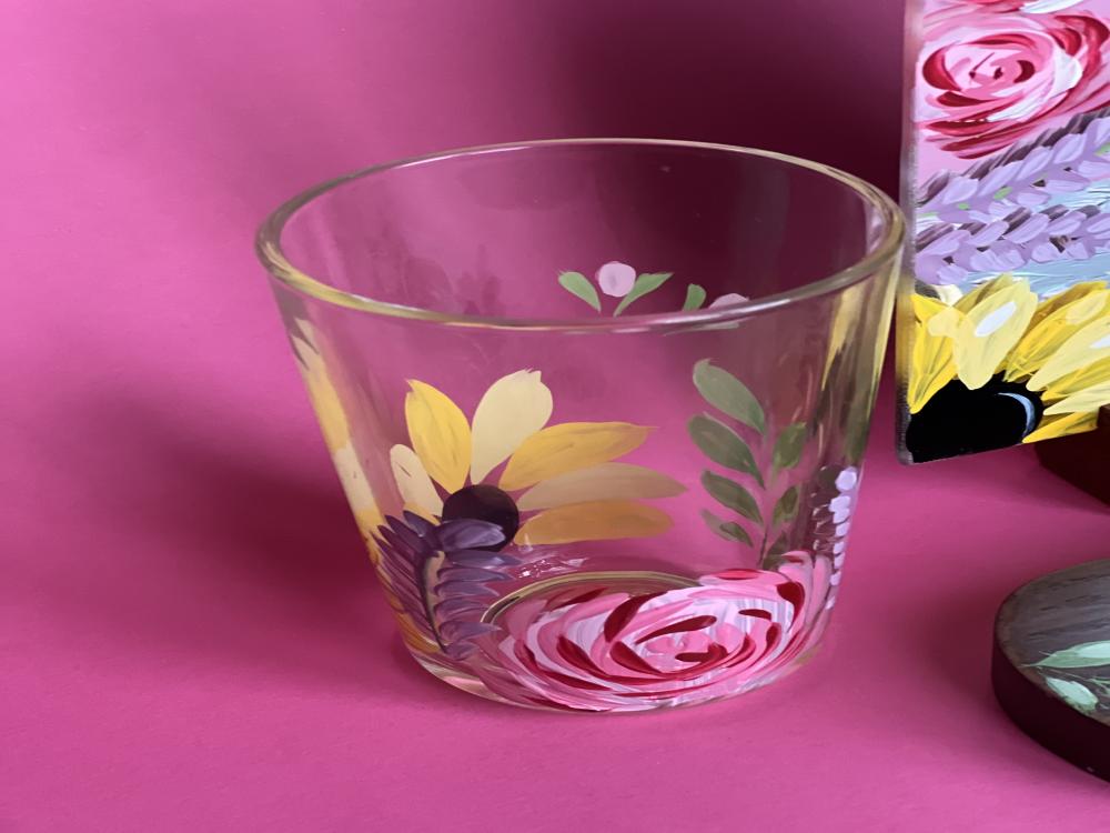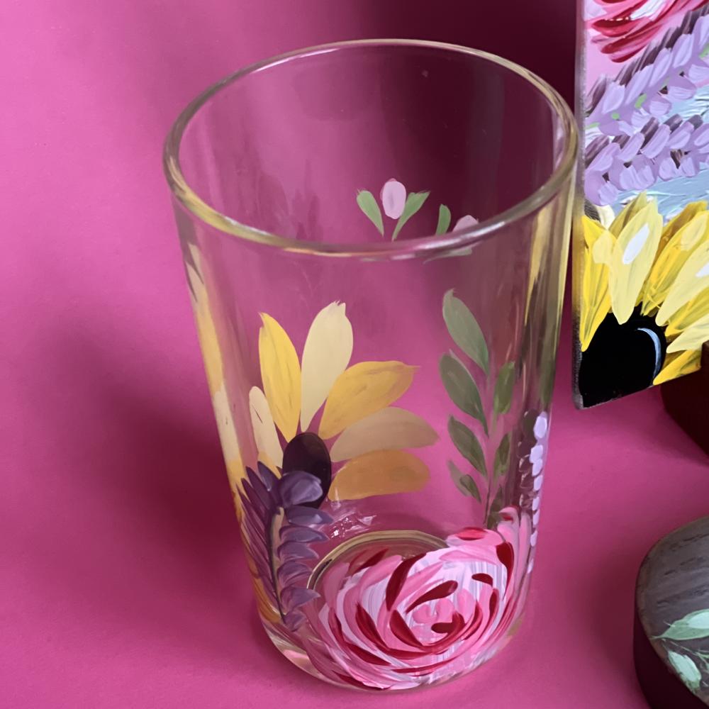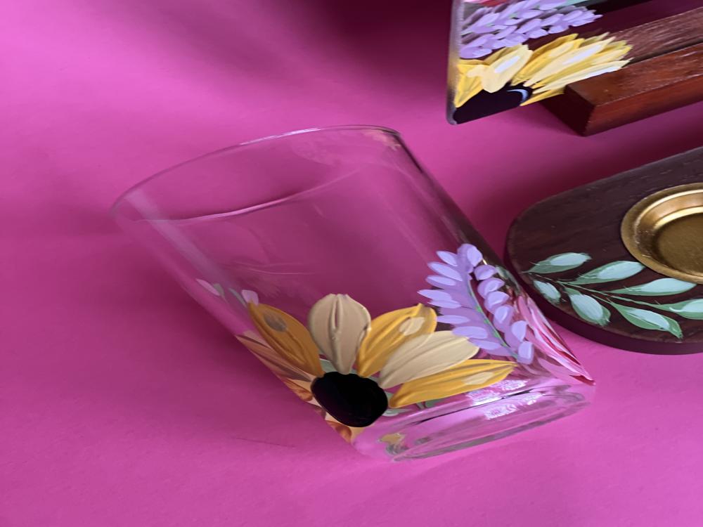 كوب زجاجي برسومات يدوية داخل علبة أنيقة مناسبة للاهداء